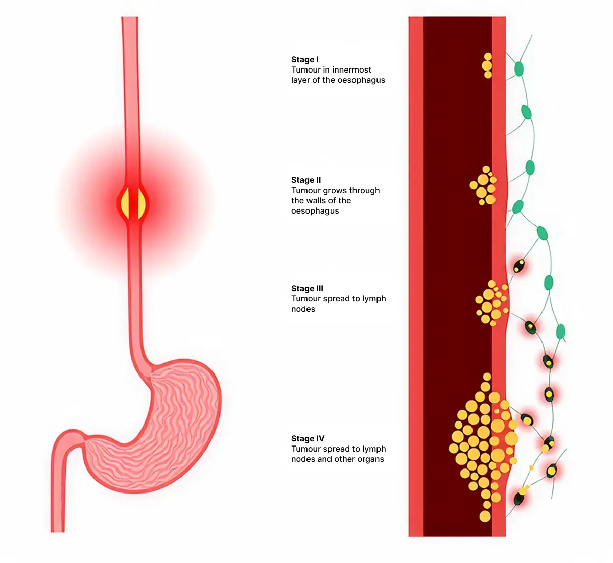 Stage IV: The cancer has directly invaded into the deepest muscle layer of the oesophagus and/or spread to other organs in the body such as the lungs, liver, distant lymph nodes, and bones.