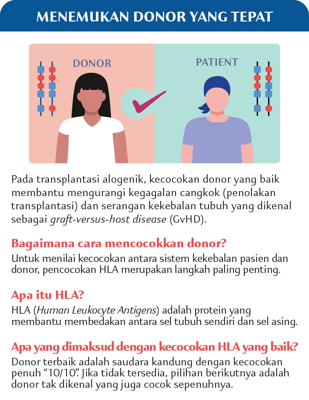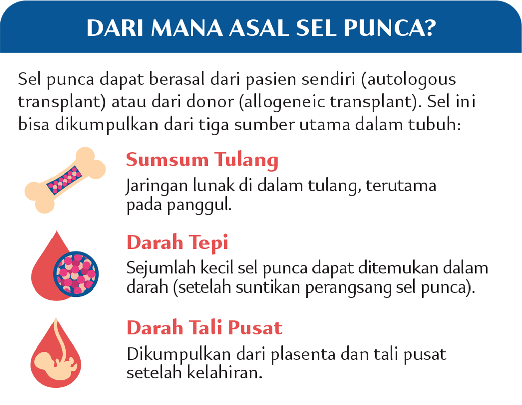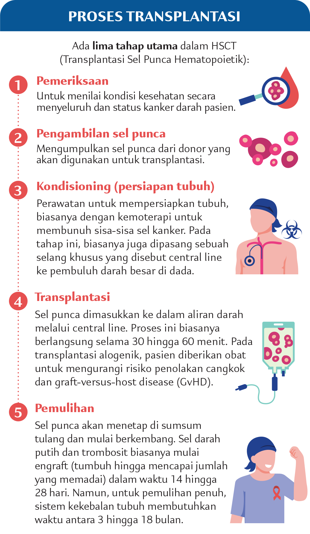 Terapi Sel Punca Hematopoietik (Haematopoietic Stem Cell Therapy / HSCT) adalah prosedur penyelamat jiwa bagi banyak pasien kanker darah. HSCT berfungsi memulihkan sel punca pembentuk darah yang rusak akibat kanker darah atau perawatan kanker yang intensif. Sel punca ini adalah “blok bangunan” tubuh, yang mampu menghasilkan semua jenis sel darah. Berikut hal-hal yang perlu diketahui ketika menjalani transplantasi.