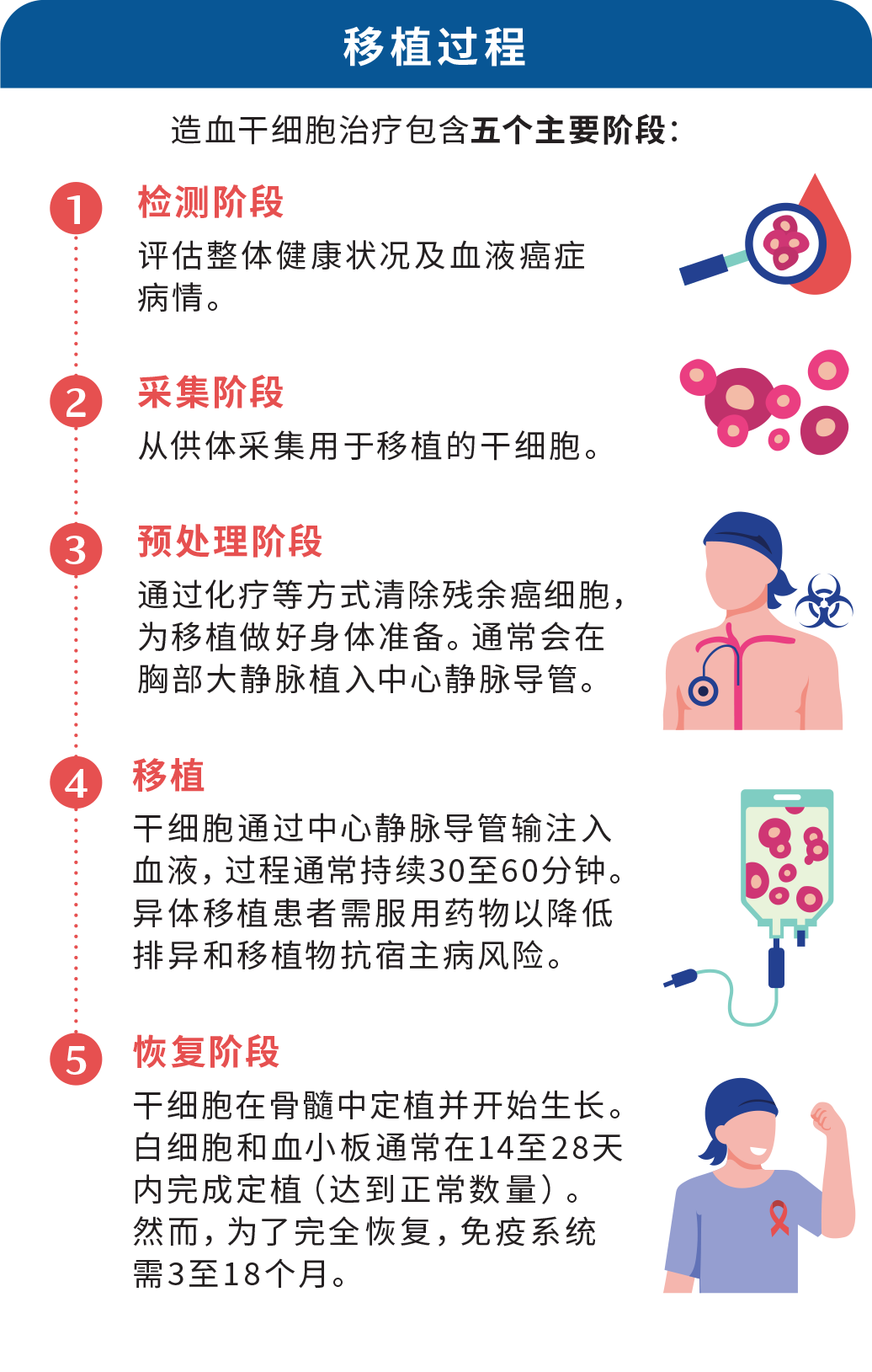 造血干细胞治疗(HSCT)是许多血液癌症患者的救命疗法,可重建因血液癌症或高强度治疗受损的造血干细胞。这些干细胞是血液的“建筑模块”,能够生成所有类型的血细胞。以下是接受移植时需要了解的流程。